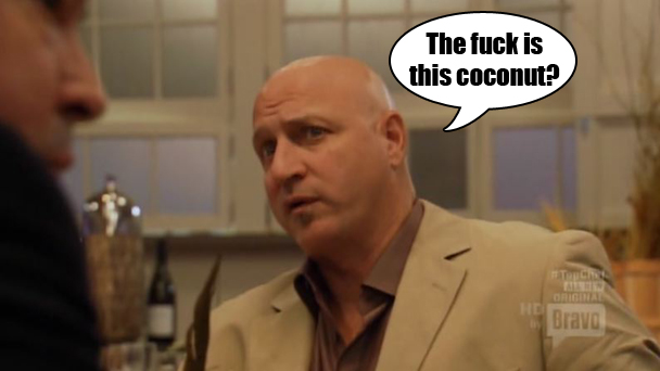 Ed is doing the front of house stuff and he actually seems pretty good at it. He's high-fiving the waitstaff and pleasantly greeting people at the door. This lasts for about five minutes and then it's all kind of a mess. They didn't decide ahead of time who was going to expedite the food, whatever that means. It does seem this season like we're getting way more vocabulary lessons. Remember that whole episode that hinged on repeating the word "albumin"? Everyone keeps taking turns expediting until Paul gets fed up and decides he's going to expedite for the rest of the night. The real problem, though, seems to be that the judges don't actually like any of the food. I mean, just if I had to pick out a thing that was problematic that would be what I would pick up. Their general dislike of every single thing they ate with the possible exception of the desserts, although Scrunchie Chris's peanut butter frozen strings cherry pile made Hugh Acheson want to barf, and it is crazy how mad Tom got about Ed's dessert's lack of coconut. (At one point, at SPOILER ALERT Judges' Table, an actual quote from Tom was: "Where was the coconut? Yeah, but where was the coconut. It needed more coconut. Where was the coconut?" Whoa, Tom.)