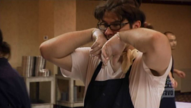 Everyone draws knives with different KA-RAZY words on them like "tomate" and "hollandaise." These are Escoffier's "mother sauces," and everyone must make a dish featuring a personalized variation on a mother sauce. Winner gets immunity. Nyesha interviews that she wants immunity so bad "it's ridiculous." That is ridiculous, Nyesha. Because it is week four, or whatever. Immunity only applies to the next stupid challenge on this show, it doesn't count for anything in the real world and doesn't even count for that much on Top Chef. Nyesha also says that she loves making sauces and if she could do one job for the rest of her life it would be saucier. So, why doesn't she go do that? If she was good enough to get on this show, she should probably be good enough to get a job as a saucier? And then she wouldn't even need to worry about this precious immunity that she so desperately craves.
