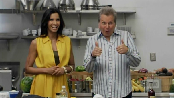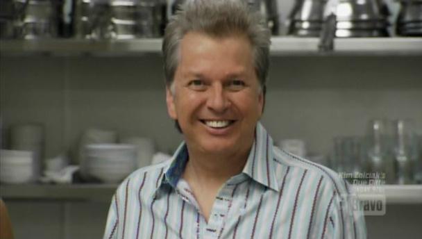 Everyone is out on the balcony drinking beers and smoking cigarettes after last week's intense brush with high society. So far, everyone who has been eliminated has been a guy, which makes Ed unhappy, because Ed is awful. "I don't want it to get down to two guys and eight girls. We've got to get it together." Huh? Why? If you're one of the two guys how on Earth could you possibly care? Don't you still just have to cook better food than the other contestants to stay in the game and possibly win? Does it matter what kind of genitalia and/or hair product the other contestant has? Also two guys and eight girls is still so many contestants. Relax, Ed. Scrunchie Chris says "guys vs. girls, this vs. that, I just need to focus on the food." That's the right attitude but somehow this also bothers me just as much as Ed getting wrapped up in the rivalry. For one thing, "this vs. that" is not a real rivalry. Use your words, Scrunchie Chris. Second of all, it's mostly just people making chit chat on a balcony after a long and stressful day. You aren't a better or more dedicated chef just because you refuse to make the lightest of social pleasantries with the other people involved in this surreal and unnatural experience. Everyone's just looking for connection, Scrunchie Chris. You don't need to be a Food Robot. Ease up. The next day, the chefs file into Le Cordon Bleu's teaching kitchen for their Quickfire challenge. Did you know that there was an outpost of Le Cordon Bleu in Dallas? I didn't. Check your local listings. This week's guest judge is Dean Fearing, who we are told has a long culinary career and classical training, but who we can see is a model for an affordable teeth whitening program with a side business as a used speedboat salesman.