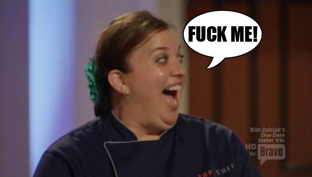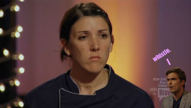 It is a real scorcher today. Everyone preps. Beverly has spent two days deveining shrimp, complains Mean Grouch. Well, you also made the same cake you already made from someone else's recipe, so maybe you shouldn't be such a BEYOTCH. (Hahah. Beyotch. LET'S BRING IT BACK, GUYS. The time is now.) Ed asked Whitney the night before if she shouldn't be further along in her potato gratin but she insists it will be fine, but now here it is the next day and she has to take off a layer of potatoes because they got discolored over night, which she says is a thing that happens to potatoes, which is correct, so she sounds like she's doing great. The real trouble starts when there is no organization and people aren't done with their second courses but the chefs start firing the steaks for the third course, but then the steaks are done and sitting around for 10 minutes so they're overcooked and also cold at the same time. WHOOOOOOPS. I mean, hey, cooking for 200 people is super tough no doubt and there are literally too many cooks in the kitchen, but also when you are serving a steak dinner the ONE thing you kind of want to get right is the FUCKING STEAK. This is the face that Scrunchie Chris makes.