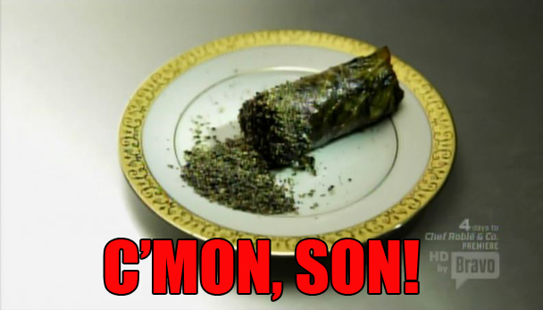 Shop shop shop. Cook cook cook. I don't know if it's just me, and it could be that the field of competitors is still just way too big, but everyone's food always looks so terrible this season. I don't think that I've seen a single dish yet where I am like "I wish I could eat my television." (That is definitely a thing that I have said in past seasons. Out loud. To my television. He is terrified!) Scrunchie makes an appetizer that looks like a cigar, which is just about the grossest thing you can make a thing look like. Even if he made dick-shaped appetizers, he at least wouldn't have to explain what "the ash that you're eating" is. Although I guess saying "the cum is wasabi mayonnaise" would also be gross but the point is that it's very gross. All of the entrees are overcooked. And dessert is just a ridiculous disaster. Chris! What are you doing with this cupcake nightmare! Chris is such a Samantha.