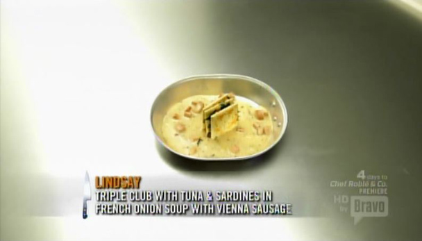 This week's Quickfire involves backpacks full of sardines and canisters of propane. Padma says something about being resourceful, but it's all kind of muddled. I mean, why? Why do the chefs have to cook tinned tofu out of backpacks from the trunks of their BRAND NAME CARS? If you're hungry, just open the tin. Onion soup in the middle of a field sounds like a fucking nightmare. But whatever. Some chefs complain that this is not their comfort zone, which is a hilarious complaint because it suggests that it is someone else's comfort zone. "I'm always at my best when I am surrounded by a camera crew filming me as I cook beans on a hot plate in the middle of a corn field." Never mind. Cook cook cook. Field field field. Everyone's dishes look disgusting and I don't even want to get into it. The blonde girl who made a "club sandwich" out of SALTINES wins. Good for her. I made you a trophy out of barf. Seriously, this is what they serve you in Space Prison.