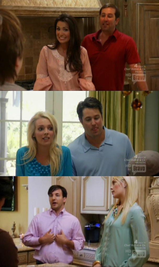 Speaking of the Elimination Challenge, everyone will be cooking for a "high society" dinner party for the landed gentry of Dallas, Texas. There will be three teams cooking three courses for three couples in three mansions for a "progressive dinner party." Chris manages to tear his eyes away from John Besch's "teeth" long enough to explain that a "progressive dinner party" is when three friends who live near each other progress from one house to the next. Oh thank God. For a second I thought there might be poor people or black people at this dinner. There are not. Shit is white as fuck.