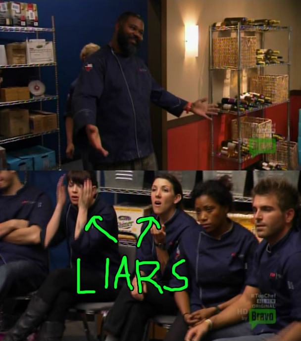 In some previous season, perhaps Top Chef: All-Stars, the producers had done away with the "thrilling" grocery shopping montage, but this season we are right back at it. They always make it seem like there's some kind of genuine tension to the shopping, as if between the time limit and the limited budget someone gonna diiiiee. But no one dies. And everyone always leaves with plenty of groceries. And it's still the same afternoon, it's not 10 weeks later. So whatever. Although I guess this week's shopping trip IS a little dramatic because Keith was in charge of buying the shrimp and he bought pre-cooked shrimp. This is where Keith first launches the "No One Told Me" defense. With every mistake that he makes, he is ready to let you know that no one told him it was a mistake. Well, OK, Keith, but also you are literally a big boy now. Keith seems like a very nice guy, and I'm very glad that cooking changed his life while he was in prison (probably the only thing I know about any of the people on this show at this point) but, you know, you're not in prison anymore. Congrats. Now stop thinking everyone is going to hold your massive hands and guide you down the tortilla aisle. As far as buying pre-cooked shrimp is concerned, it seems less of a matter that no one told you that you shouldn't buy pre-cooked shrimp as much as no one told you that you were ON A COOKING SHOW AND HAD TO COOK THE STUFF.