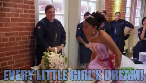 This week's elimination challenge is a quinceanera, which Padma explains is "like a sweet 16 party." Oh phew. At first I was like WHAT IN THE HELL IS THIS STRANGE FOREIGN CUSTOM?! WE MUST GO TO WAR WITH MEXICO! But now that I know it is "like a sweet 16 party," I feel the sweet comfort of human relatability. I guess we really are all just lonely creatures trapped on a rock shuttling through space LOL. The chefs draw knives and split into two groups: the Green Team and the Pink Team. Huh. OK. Why green and pink? Nevermind who cares. We meet Blanco Flores, the birthday girl, whose full name is definitely appropriate to broadcast on national television, at which point you do have to stop and wonder if we are really going to bring CHILDREN into this mess, but the answer is yes. She will never forget the wonderful day she got to celebrate becoming a woman with Ty-lor Boring. (Real name of an actual contestant!) Edward, who is quiet this week but still somehow my least favorite, says that he doesn't know who she is, maybe she's a Mexican rockstar. Or she's just a little girl, Edward. Blanco goes to both groups and explains what some of her favorite Mexican dishes are. And then all the chefs have a Mexican-off. There's the one dude who was raised "between California and Mexico," which kind of just sounds like he was raised "between upper and lower Mexico," but whatever. I mean, in terms of cultural shock and difference, I'm sure there's plenty of it between Mexico and California, but not as much of it as between, you know, Mexico and almost anywhere else. Then there's the blonde lady who spent two years in Mexico. She says it as if she was learning how to cook down there, but I think what she was learning was how to get free drinks at the Senor Frogs foam party.