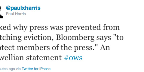 MEANWHILE, early this morning, the New York Police Department swept into Zucotti Park, birthplace of the Occupy movement, and removed any sign of the nearly two-month long protest, arresting 70 people in the process. The New York Times also tells that story (it really IS the paper of record):