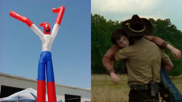 Grimes is running through the field with Carl flopping in his arms like one of those dancing inflatable floppy armed things that you see on the roofs of car washes or whatever, but if it has been filled with potatoes for some reason. That is what Carl looks like.