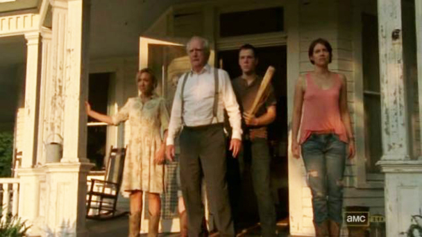 You know when people get injured and someone always says not to move them because they could have some kind of spinal injury that will only get worse if they're moved improperly? I feel like there's got to be some kind of middle-ground between "don't move him" and "run with him as hard as you can through some lumpy wheat field with his body all flopping around like a pile of fish." Yikes. I hope that Grimes is just grinding bullet fragments into Carl's major organs and also spine and also face. (No offense to Carl. I'm sure he's a decent kid. I'm just saying, we spent all of last week walking through some old woods, it's time to pick up the narrative pace.) Meanwhile, Shane is bringing up the rear with the fat dude who shot Carl, who is so fat that he can't even run very well! I have a feeling this is the only time we will ever see him running, and that the only reason they are making such a point of him having trouble keeping up is just to be very realistic about what it is like for people with slower metabolism when they are unexpectedly forced into exercising. "Wait, I need to stretch first!" Grimes pulls ahead and runs towards a beautiful farm house that is seriously just such a nice farm house. A woman with binoculars sees him coming and shouts for her dad and a whole gang of people come pouring out onto the porch (which is just beautiful, you've got to see this farmhouse, I'm telling you) and now they are helping Grimes inside and the old man is asking for his "full kit" because he is a doctor (although something tells me he's not a real doctor because he doesn't say "STAT!") and they lay Carl out on a bed and proceed to save his life. Maybe. They tell Grimes to give them some space, so he goes back out onto the porch and wipes blood all over his face. Shane cleans him up with an old rag. (PRO-TIP: When the world is consumed by the Rage Virus, always carry extra rags around in case you need to wipe blood off your friend's face because his son got shot trying to pet a fucking deer.)