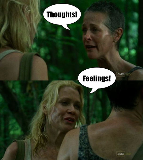 The doctor explains that the bullet was slowed down by the deer, which saved Carl's life, but that the bullet didn't go through clean, and is broken up into six pieces inside Carl's body. Wait, is that actually better than the bullet going through clean? I don't know a lot about shooting little boys with bullets, but it seems like there are a few scenarios in which a bullet just passing clear through someone's body might actually be better than having bullet shards all over the place? Shoot. I knew I should have paid more attention in my prerequisite Shooting Children class in college. Grimes starts freaking out because Lori doesn't know. We see Lori still in the woods (good grief) and she's nervous because they all heard a single gunshot. This leads to all of them having some Therapeutic Jam Sesh. Ugh. ENOUGH WITH THE WOODS AND THE EMOTIONS. Daryl is like "enough with the woods and the emotions."
