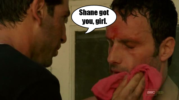Time is running out for Shane to come back with the medical supplies and AGAIN, Grimes wants to go and find him. Ugh, GRIMES! Doesn't the doctor have any bear tranquilizers or anything that we can pump into Grimes's neck and make him lie down. Lori says that he's not allowed to leave because she needs him there with her and Carl, which is already 10 times more explanation than anyone should have to give in this situation. The conversation should be more like this: