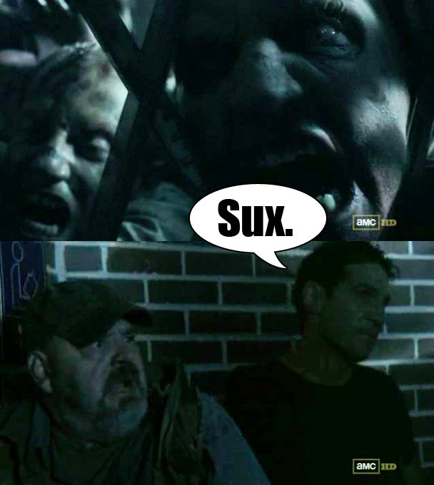 This week's episode opens with a flashback to Lori talking about her marriage with a colleague on the playground, which is just infuriating. NO FLASHBACKS! If we're going to be stuck in an endless nightmare of ambulatory rotting flesh, then let us be stuck in an endless nightmare of ambulatory rotting flesh. Jumping around back and forth through time just feels like a cheat. I know that this particular scene was just supposed to remind us that Grimes got shot and that it was hard for Lori and Carl, because now Carl has been shot and it's going to be hard for Lori and Grimes, and so the writers are doing what is called "show don't tell," except all of the characters will do plenty of telling throughout the episode so what is even the big deal about showing. If I had a shotgun for every time someone said to Grimes, "Remember when you got shot and were in the hospital," I would have, like, four shotguns. That's so many shotguns! You don't need that many. Give one to Andrea. Anyway, Shane pulls up to the playground and tells Lori that Grimes has been shot (so really I guess this scene is show AND tell) and then she goes and tells Carl, who makes Carl Faces all over the place, and I'm not entirely sure what we're supposed to be feeling in this scene because on the one hand it's all about to get way worse when the world turns to shit and also we know that Grimes survives but we also know that Shane tries to rape Lori in the CDC, I mean, there's a whole future of terrible decisions about to be made, but even more importantly: nothing new happens. Like, we spent all last season dealing with Grimes being shot and Lori and Shane fucking in the woods and Carl making faces. It took 100 hours and we did it. So who is this flashback for? (It's also not pegged to anything. Like, we don't see anyone remembering this. It is basically God's Flashback. And it's boring.) I never thought I would say this, but can we please just get back to the endless Zombie Wasteland please?