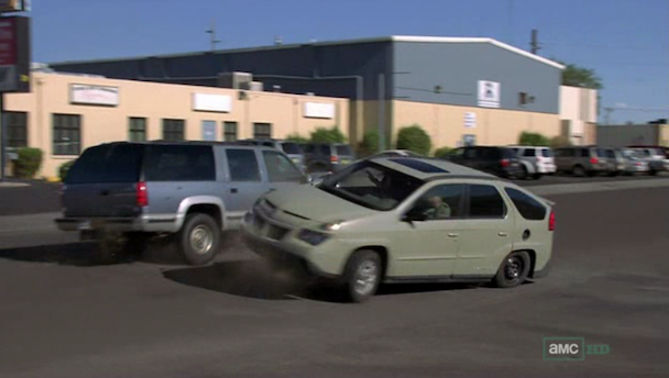 Then we see Walt picking Hank up again for another stake-out. But instead of going to the factory farm, like we all THOUGHT, Hank tells him they're taking a detour -- "There's an industrial laundry I want to check out, it's not far." AHHH!!! CARTOON WITH EYES POPPING OUT!!! SIREN NOISES!!! This was very tense, obviously, and as Hank is telling Walt to take the turn into his place of illegal meth business, we're all thinking out loud "What's going to happen how is he going to handle this what is he going to do?!?" Then he misses the turn and gets into a car accident BOOM GOES THE DYNAMITE, DROP THE MIC!