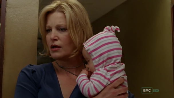 They transport Walt to the desert and when we see him again he's on his knees with a sack over his head. Uh-oh again. Gus arrives and tells him that he's fired, and that he cannot show his face at the laundry or go near Jesse again. Walt points out that they can't kill him, because Jesse wouldn't cook for them -- if they could kill him, they would've done it already -- so, you know, OR WHAT? Don't go near him again or what? "For now," Gus says, and also informs Walt that they're pretty much going to kill Hank, since Walt hasn't taken care of him yet. And then: "If you try to interfere, this becomes a much simpler matter. I will kill your wife, I will kill your son, I will kill your infant daughter." With that, they pull away and leave him in the desert. UHHHHHHHH. God damnit, Gus! You are so terrible! Last week I loved you and this week I hate you so much again! I can't believe you toy with my emotions so readily and so easily! YOU JERK! You big huge jerk! DID YOU SEE WHEN THE BABY HAD THE NECKLACE IN HER MOUTH? HOW COULD YOU THREATEN THAT?