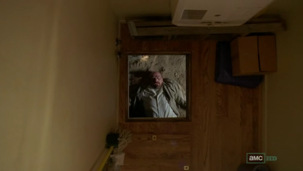 The final shot shows Walt lying in the basement while the camera pans up through the first floor, effectively portraying him as a dead man. Six feet under. Laughing and scaring everybody straight to hell. Ugh. This show. THIS SHOW!