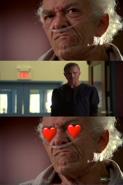Ugh, the next scene was annoying -- when Gus visited Hector in the retirement home again. Now that Gus has avenged the death of his life parter I no longer feel sorry for him, and I guess that's kind of what they were going for with this episode anyway. We're back to hating Gus. So, he explains to Hector how everyone, including his grandson, is dead. Then he brings out Jesse, telling him that Jesse is the one who shot his grandson to death. "He was the only family you had left. Now the Salamanca name dies with you," Gus says. He asks Hector to look at him repeatedly, but Hector never moves his gaze from Jesse. And who could blame him. Right, ladies?