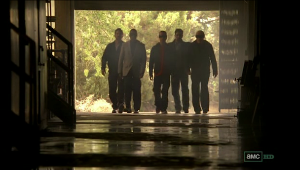 THEN, we are done with those short scenes. Now we're onto long scenes. Jesse, Gus, and Mike are blindfolded and being taken to the cartel's meth lab. They walk in looking like a bunch of bad boyz: