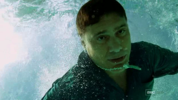 Gus is sitting with his hands on his head because he doesn't like the bikini babes, so Don Eladio sits down to cheer him up. "There's no emotion in this. You of all people should understand, business is business." Ugh, Don Eladio. You killed his best friend and partner and maybe PARTNER PARTNER right in front of him for no reason you big jerk! Gus leaves to go to the bathroom, and is followed by a big fat guy to show him the way. He pukes very daintily and by the time he's done, everyone is dying. The big fat guy is already dead when he opens the bathroom door and Gus literally brushes his shoulder off and walks over him. WHAT A VERY COOL MURDERER BADASS METH GUY WHOM I LOVE! The camera follows behind Gus as he walks back to the pool, which is also very cool, and he sees that everyone is basically dead, except (I think) Handsome Gabe, who Mike then kills, and Don Eladio, who dies slowly and falls into the pool. PERFECT! But Gus looks like he's being effected by the poison. Uh oh.