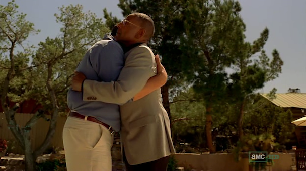 And then the final scene. WHAT A GREAT SCENE! Gus, Mike, and Jesse are at Don Eladio's pool, and Jesse is expressing his concerns to Mike, who responds, "I promise you this. Either we're all going home or none of us are. Now settle down." YAY! Everyone loves each other, that's what I like about this show. Then Don Eladio comes out with a million cartel members and makes Gus give him an awkward hug: