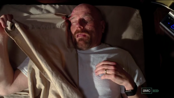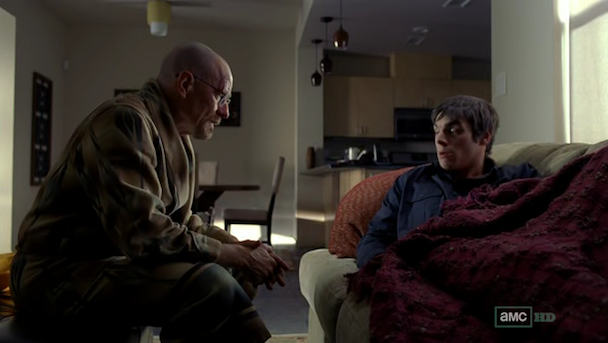 Walt finally wakes up from his beat down nap to find that Walt Jr. had his glasses fixed. Aww, jeeze. He comes out of his room and sees that Walt Jr. spent the night on his couch, after telling Skyler he was sleeping at a friend's. Awwww, jeeeeze. Walt explains his beat up face by saying he had taken pain killers with a few beers, and apologizes for the previous night. He tells Walt Jr. that he doesn't want him to remember that way. The one memory he has of his father who died of Huntington's Disease when he was seven, he says, is from his hospital room, with his father looking at him -- but not seeing him -- and breathing. "This rattling sound, like if you were shaking an empty spraypaint can. Like there was nothing in him." Basically, he does not want Walt Jr. to remember him as a broken man.
