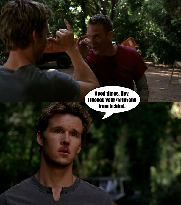 Let's get some boring dumb stuff out of the way because we've only covered the first five minutes of the show so far: so, Jason tells Hoyt that he fucked Jessica doggystyle and Hoyt punches him in the eye so Jason puts a popsicle on it because that's a thing and then Jessica comes over and they fuck some more because that is what best friends do. After fucking they have a really soulful conversation about blowjobs or something? It's gross. Then Jessica FASTRUNS out of the house, which is always hilarious. There is a knock at the door and it is that anti-Vampire pastor from last season but now he's a vampire? And that's it because somehow that is supposed to be a cliffhanger? Also, Andy Bellefleur asks that witch-waitress out on a date holy moly WHO CARES. Sam visits Tommy's grave and Hoyt's mom says that she's Sam's mom now (?) and then Sam and his girlfriend kiss. MOVING ON: