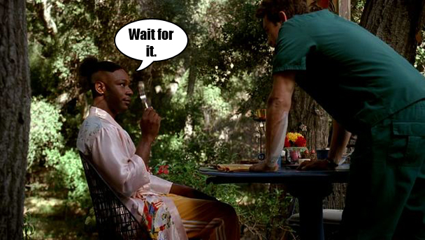 Lafayette and Jesus are enjoying a gorgeous outdoor brunch and boy did they earn it after last week's episode. Eat up, boys, you must be famished! Jesus can kind of tell that something is up with Lafayette because he's sitting completely still and not saying anything and his hands are resting palms down on the table and his eyes are tracking Jesus like guided missiles, all of which is to say that Lafayette is acting a little bit funny, but that doesn't stop Jesus from basically delivering a monologue. Now, I'm no relationship expert, but I say that if your partner is completely unresponsive to the first couple of things you have to say, take them to a doctor, don't just prattle on. Who knows, they might be possessed by a witch who is going to stab you in the hand with a fork. Whoops! Lafayette stabs Jesus in the hand with the fork. But not before the show gives us lots of menacing close ups of the fork. Here is Lafayette holding the fork up by his face. Here is the fork being stuck into an egg. Here is the fork with egg dripping from its tines. It's like Chekov said, if you put a brunch fork on the mantle in Act I, that brunch fork better get sunk into a human hand by the end of this show is awful. (It's also worth pointing out that last week's teaser for this week's finale SHOWED LAFAYETTE STABBING JESUS IN THE HAND WITH A FORK, like, we get it! Is there something I'm missing? Is this more amazing than I even fathom?!) STAB STAB STAB! EGGS EGGS EGGS!