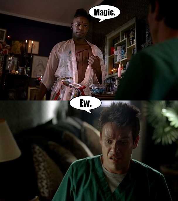 But, so, Jesus is like "I don't know how to give you my powers or if that is even possible," and then two seconds later HE JUST STRAIGHT UP GIVES HER HIS POWERS. He knows the magical power-swap incantation and everything! That was a lot easier than Marnie thought, probably. Then Lafayette/Marnie stabs him with a kitchen knife. Awww. And the day before he was going to retire from magic! R.I.P. Jesus.