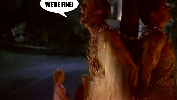 Uh, how did everyone suddenly become very magical? No time to explain! Bill and Eric are on fire! Of course, fire doesn't kill vampires? So I'm not sure what the point of this even is? Did this show seriously forget that FIRE DOESN'T KILL VAMPIRES? And we have to be the ones to remember that? Good grief! Please, True Blood, pay the mildest of attention to what your show is even about for the love of FUCK.