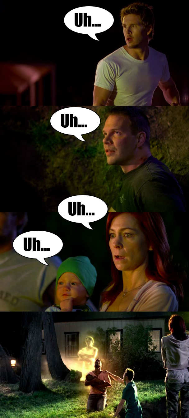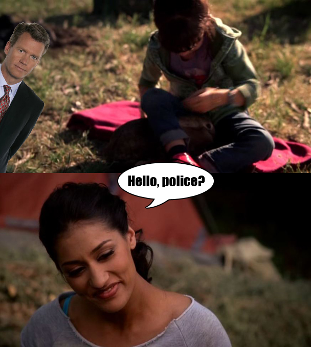 Sam tells his new girlfriend that they should get out of town before her werewolf ex-husband (LOL) comes back. She says that she is trying to teach her daughter not to run away from her problems. "I'm not talking about running away," Sam says, "I'm talking about camping. Getting back to nature is the opposite of running away." Uh, rest your case, Sam, because that is the dumbest thing I've ever heard. His girlfriend is like, "I guess you're right." No, he's not. I mean, go camping, who cares, but camping absolutely still counts as running away. "Has anyone who ever had something to hide or a reason to be fearful of being found ever gone off the grid? Nope." That is Sam. What a dummy. But, so, they go camping, and then Sam turns into a bunny rabbit so that his girlfriend's daughter can pet his naked body and I am sorry, but that is just the WEIRDEST THING but the girlfriend finds it CHARMING.