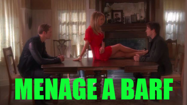 Sookie has a sex dream about Eric. Oh wait, Bill is there too. GROSS. This is going to be VERY GROSS. They all start barfing and wiggling around in the barf and Sookie screams "barf on my face! barf on my face!" and they do. At first, Dream Eric and Dream Bill are about to get in a Dream Fight in the Dream Kitchen, but then Sookie is like "No, go in the living room and let's talk." Haha. Cool dream! You know those dreams that just involve important conversations about where everyone is at, emotionally? This is one of those. Sookie explains that she is in love with both of them, which, fine. But then she also says that she's "always been this self-conscious, good little girl who's been too scared to think outside of the box, especially when it comes to love and sex." Uh, wait, what? GOD DAMN IT, DO THE PEOPLE WHO MAKE THIS SHOW EVEN WATCH THIS SHOW? Not only does Sookie fuck vampires, but she was the first person in her community to do so openly. Under what circumstances is she just a self-conscious, good little girl who has been too scared to think outside of the box? Unless the box is just only having sex with one vampire at a time and now she wants a vampire three-way, in which case, oh, OK, got it. Sookie wakes up and realizes it was just a dream. Or was it? If she was dreaming, why is she covered in barf?