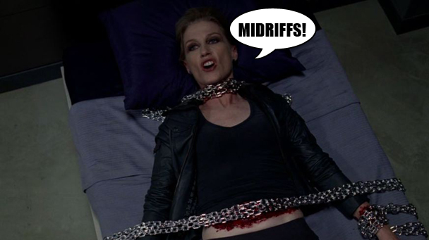 Alcide the werewolf is carrying Fairy Sookie through the graveyard to safety after she got shot in the great Witches Vs. Vampires War of 2011 but he is overtaken and Sookie is snatched from his werewolf hands by Vampire King Bill, who rushes Sookie inside and lays her out on the couch and tries to feed her vampire blood to heal her from the gunshot wound. "Werewolf, I'm going to need you to shut the fuck up," he says to the werewolf. It's a really tense moment, I'm sure. Apparently, Sookie is so mortally wounded that she won't even drink Bill's vampire blood to get better. "What do we do now?" the werewolf asks. "Pray," the vampire says. "Werewolf and vampire? Who would listen?" the werewolf says. HEY BOYS, THIS IS NOT A COLLEGE PHILOSOPHY CLASS, GO HAVE A FRESCA. "That I do not know," Vampire King Bill says. Oh my goodness. Is this it? Is Sookie going to die? Will vampire and werewolf acknowledge the blasphemy of their existence in a godless world and suddenly come to terms of peace in the recognition that the cold absurdity of the universe leaves no room for petty squabbles (because it is all one giant petty squabble)? NOPE TWO SECONDS LATER SOOKIE IS FINE SO I GUESS IT WORKED AND THE VAMPIRES AND WEREWOLVES ARE GRUMPY AGAIN AND ALSO DIDN'T BILL BASICALLY GET CAPTURED AT THE END OF LAST WEEK'S EPISODE BUT EVEN THAT DIDN'T LAST MORE THAN THREE SECONDS BECAUSE THIS SHOW IS JUST VERY SMART AND VERY COOL AND VERY WELL-WRITTEN AND VERY EXCITING. I AM ALWAYS ON THE EDGE OF MY SEAT WONDERING HOW THE PLOTLINES WILL BE RESOLVED IN TWO MINUTES WITH LITTLE EXPLANATION AND ABSOLUTELY NO REGARD FOR THE SELF-IMPOSED LAWS GOVERNING THIS GARBAGE WORLD.