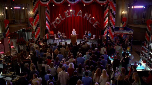 Bill explains to the, like, Prime Minister Witch or whoever that lady is that they need to cancel the Festival of Tolerance (lol) because he has a bad feeling about it and the Prime Minister Witch is like "absolutely not" because CNN is going to be there. Uh, pretty sure CNN will get over it. They are probably going to be busy covering the toppling of Col. Muammar el-Qaddafi’s regime in Libya, anyway. Also, later, when we actually see this Festival of Tolerance, which is just 100 people in some Louisiana hotel ballroom, yeah, GO AHEAD AND CANCEL IT WHO CARES. The mylar balloons that spell out the word "Tolerance" are a tax write-off anyway. But first, more of this.