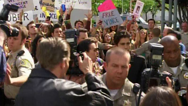 Guys, can you imagine what it must be like to get so many emails and phonecalls that you can't even turn your phone off for two hours to have sex with your ex-girlfriend who runs a movie studio while you're going through a trial separation from your wife? So many emails! Oh wait, hold on: casually dropped Taylor Lautner reference. And now back to the show. Ari has to go meet The Boyz at Police Town. There are already Vinnie Chase superfans hanging out front of the police station holding homemade signs. Wait a second. No there aren't. I know that the life of a super-celebrity is a rare, magical garden to which none of us has the key, but people do not have time to leave work, go home and make signs, and then grab a prime spot outside of the police station in the half hour between the suicide and Vince going to the station. Hanging outside of a court room? Maybe. Cheering Vince on when he leaves rehab? Sure. But this is nonsense. Even for this show that is 100% nonsense.