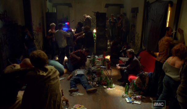 So he leaves and goes back to his apartment, which has become a place for crazy people on drugs to go and be crazy. As he pulls into the driveway, a guy is carrying out part of his sound system (or something). As he walks in, people are being violent and having sex and basically moshing? Having a big mosh party. He sits on the couch and makes me want to die.