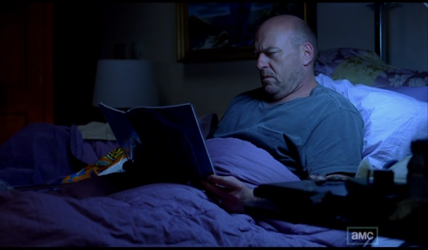 Hank watches bowling. Marie gets him lunch. Hank says he's not hungry. Marie says, "So don't eat it." Guy from the police station from before comes over. Says he wants help on a homicide, possibly drug related. It's Gale. He explains the scene of the crime to him. Has a copy of the lab notebook that he gives to Hank. Tries to convince both Hank and the audience that it is reasonable that this guy would be asking Hank, a DEA agent, for help on this case. Guy leaves. Hank turns on TV.