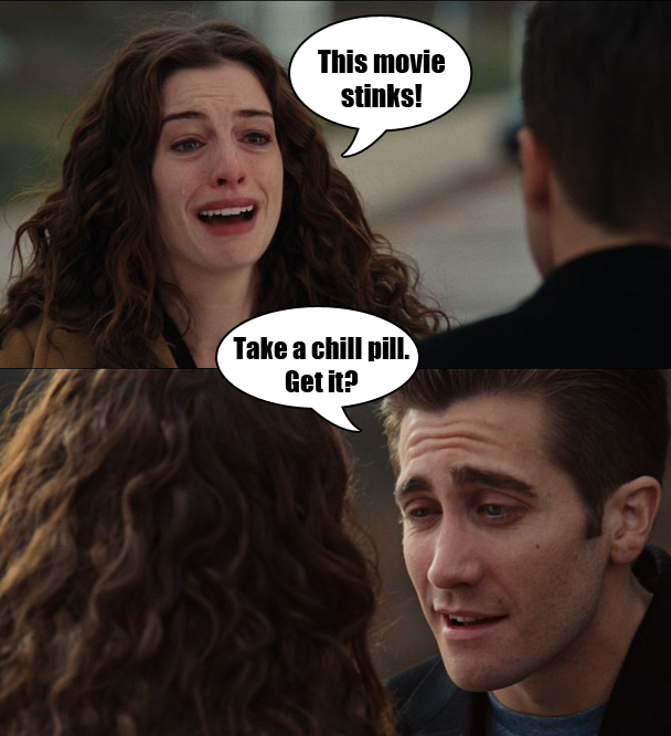 -Even though Anne Hathaway breaks up with Jake Gyllenhaal, at first when he tries to win her back SHE is mad at HIM? Oh no! Doctor! She overdosed on upside down medicine!