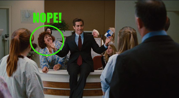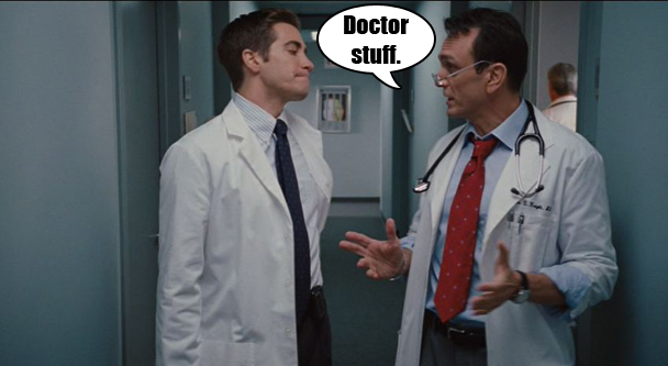 One day, in his attempt to sell more drugs than the Evil Pharmaceutical Rep (I am not joking, this movie has a villain who is basically just another pharmaceutical rep? And his name, obviously, is Trey Hannigan) Jake Gyllenhaal gives Hank Azaria a thousand dollars to let him walk around his office with him wearing a doctor's coat.