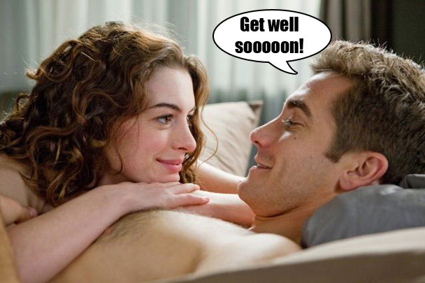So, Anne Hathaway's Parkinson's gets worse, and Jake Gyllenhaal starts getting nervous about what a long-term relationship with a very sick woman would be like, and he starts using his connections in the medical community to try and "cure" her even though there is no cure and he does this by doling out Viagra samples but nevertheless. Anne Hathaway breaks up with him.