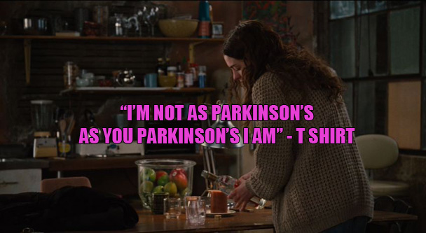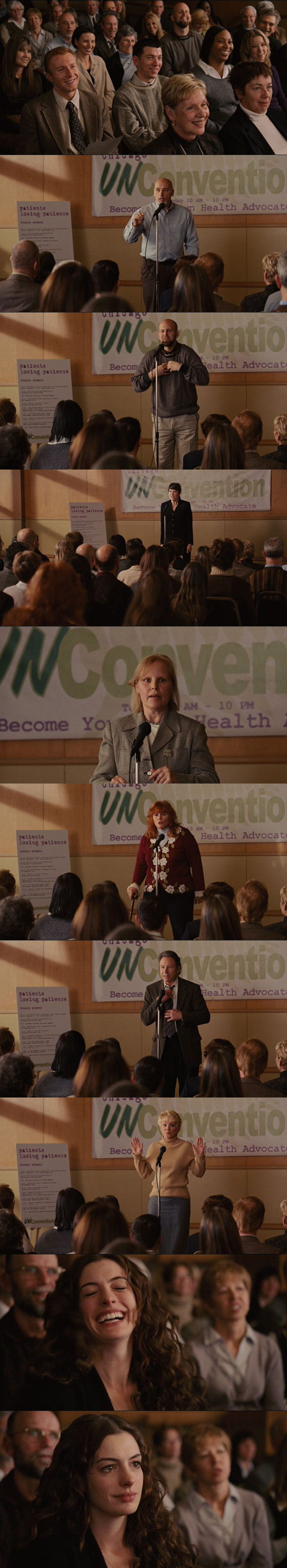 Now again, fair enough, except: HOW LONG IS THIS SUPPORT GROUP THAT A DOZEN PEOPLE CAN JUST GET UP AND DO THEIR PARKINSON'S STAND UP ROUTINE? Anne Hathaway, of course, laughs and cries. Anyway, she pages Jake Gyllenhaal to come meet her, which he does. After the comedy show ends, Jake is in the reception area getting some snacks and meets a middle-aged man. The middle-aged man asks what stage of the disease Jake's wife has. "Oh," he says, "she's my girlfriend. She's got stage 1." The man nods. "Lots of ups and downs," he says, "good days and bad days." Jake smiles. "Yeah, mostly good days, though." The man tells Jake that his wife has stage 4 Parkinson's. "Any advice to give me?" Jake asks. "Yeah," the man says, "pack your bags and get the hell out of there." He then goes on a five minute monologue rant about how horrible it is and how much he hates it, describing a living nightmare. Then he just goes "I love my wife but I wouldn't do it over again. I'm sorry, I'm out of line." UH, YEAH, YOU FUCKING ARE OUT OF LINE. This scene is INSANE. Like, I have no doubt that the amount of sacrifice it takes to support and love someone with an illness like Parkinson's is draining and exhausting and at times makes you doubtful, but also there is no fucking HUSBAND of a Parkinson's sufferer who is going to bitch about it to a complete stranger IN THE MIDDLE OF A PARKINSON'S SUPPORT GROUP. Ugh. No. Nope.