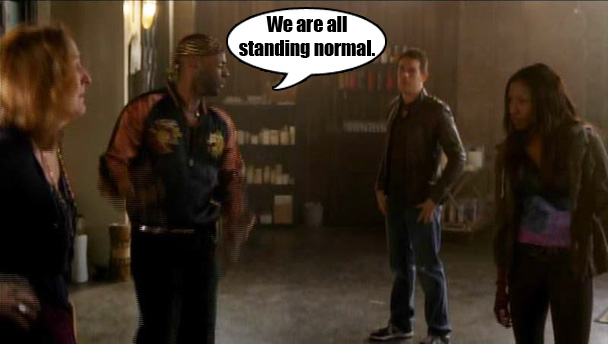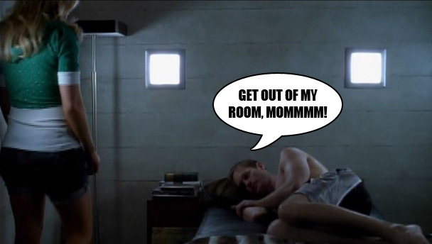 Bill goes with his new girlfriend to visit Andy Bellefleur's grandmother? Wait a second, how old is she? 1,000,000. Andy would like a Red Bull, please! Haha. That part makes me laugh. The 2,000 year old grandma tells him that Red Bull is vulgar, which I think is supposed to be a joke about how it's more vulgar to drink Red Bull than Sobe True Blood, which, fair enough, that is probably actually true, but also: then why do you have Red Bull in the house? If there's Red Bull in the house, Andy should be allowed to order it. WHAT IS THIS, COMMUNIST RUSSIA? Blah blah blah, this scene lasts forever, and then finally Bill learns (using his "vampire-vision," ugh ugh ugh) that his new girlfriend is also his great great great granddaughter. OOOOOH, MAKE ME FEEL GOOOOOOOD. Gross, Bill. Maybe you should have thought of that before you stayed in the same small town for 10 billion years. Anyway, he breaks up with her, which is reasonable except that he's a vampire so their relationship was already pretty problematic so whatever, keep fucking your great great great granddaughter if you want, you undead corpse king. THAT IS THE LEAST OF YOUR PROBLEMS.