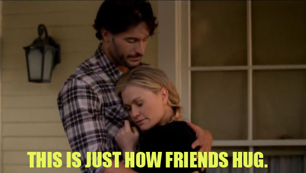 Sookie asks the Werewolf Alcide to come over and help her wrangle Eric. They find him swimming in the pond and shouting norse at alligators. He refuses to come in from the water, which, fair enough. That's the one thing this show has finally gotten right: swimming is fun. Alcide turns back into a naked human man and him and the naked vampire man are about to have a fight but then Eric's skin starts burning. Uh oh, I guess he is...sobering up? From the fairy cocktails? They wrap a blanket on him but he doesn't want to go inside because he likes swimming too much. Oh man, I HEAR YOU, VAMPIRE ERIC! You guys, can we take a brief second away from this fucking nonsense show and just agree that swimming rarely gets the appreciation it deserves in popular culture? Anyway, now Eric is all sad because he's never going to get to swim in the sunshine again. Total summer bummer. "Stay with me," Eric says. "Can't," Sookie says, "human stuff to do." Haha. Best new excuse/explanation for anything. She leaves Eric to his Basketball Shorts Only clubhouse and goes upstairs to fight with Alcide about whatever anyone on this show is ever fighting about. "You drank the mythical creature straight from the carton!" "You never glamour me anymore." Etc. Their fight is over very quickly and they give each other just a normal friend hug that is very normal and is just the kind of hug that friends give each other.