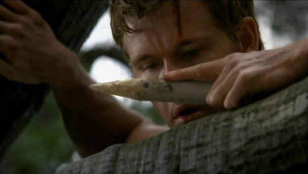 Also, why does this show need to have Panther People AND Werewolves? (And dog-shifters, but let's even set those aside for a minute.) Like, could Charlaine Harris's story simply not be told without two kinds of wild-cat shapeshifters? Probably. "This sucks!" is what someone would have said if this show only had Werewolves in it. "What, no Panther People? Throw this show in the garbage!" Everyone would have said that. Gotta have both kinds, definitely. Anyway, Crystal's boyfriend chases Jason through a park and Jason climbs in a tree and fashions a spear out of a branch and/or gets it as a gift from his sponsors because only a Hunger Games level tribute would get a spear that quickly and he jumps from the tree and stabs the Boyfriend Panther through the head.