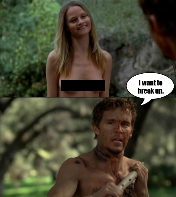 Haha. There is nothing funny about rape, you guys, but there is something funny about Jason Stackhouse getting raped to death by Panther People teenage girls. FINISH HIM! One girl comes in and is about to lose her rapeginity with him but he tells her that your first rape should be special with a boy you really want to rape and that she should save her rape for when the time is rape, so she loosens up his ropes and lets him free. P.S. Someone in this scene shouts "BREED, GHOST DADDY, BREED," and it is not important who says it, only that it happens. When Crystal's boyfriend finds out about this, he gets so mad he just takes his jeans right off, which is kind of a theme of this episode. Like, every five seconds someone is taking their pants right to the pubic hair line and holding them open there for an excruciating and dangerous 10 seconds in order to deliver some very weird and always overly-serious dialogue before shifting into some kind of something who knows anymore. Like, look at this: