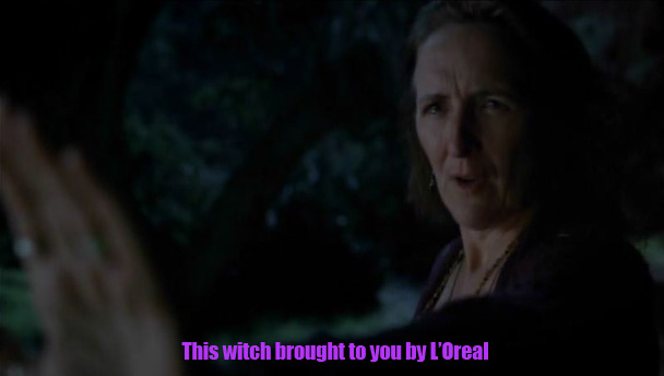 And so but OK, the witch. Everyone is like "Come on, witch, unwitch the stuff." Oh, but first she has this, like, fever dream about the spirit that is inhabiting her where she gets burned at the stake for being a witch and the New Witch is like "we have to stop this!" except why? Like, it seems to me that the great tragedy of our ancestors burning witches at the stake was that they were just burning eccentric non-witches or people with mental illness. But if it is an actual witch they were burning at the stake, kind of seems like she deserved it? I'm just saying, if their goal was to burn a witch at the stake, and it turns out she really was a witch, then I'm not sure how you can get mad at them? They are doing exactly what they intended to do. Also: considering the fact that her evil spirit spans hundreds of years and returns to exact terrifying revenge on her enemies, maybe burning her at the stake was at least a step in the right direction. Anyway, the New Witch is like send me a sign, so the Old Witch thumps a book on the ground. Ha. Lazy.