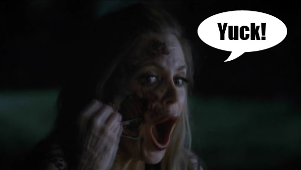 R.I.P. White Trash Abusive Pervert Panther Boyfriend. Crystal shows up and Jason is about to stab her too and she is like "We are going to be Panther King and Queen of the Panther Meth Junkyard" and Jason is like "Fuck you," and she just laughs and laughs. Hahaha. Yikes! BREED, GHOST DADDY, BREED! Jason falls down on the side of the road and Hoyt and Jessica find him. Jessica feeds Jason her healing vampire blood. Some kind of Lillith Fair Mix wafts out from the truck doors. To be barftinued.