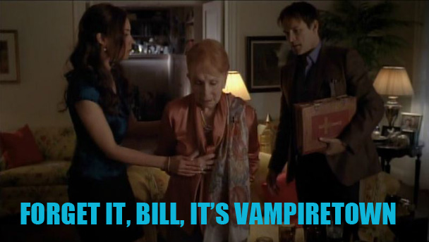 Someone is at the door. Bill forces his way into Sookie's house because Eric actually bought the house under a Vampire Trust so I guess all the vampires are her landlords and she can't rescind their invitation. (Might as well bookmark this Wikipedia page because we might never be done editing it.) He insists on looking for Eric even though Sookie says he's not staying with her, then she says "When have I ever lied to you." Uh, that is easily one of the worst cards to bust out in the middle of your very first lie. Bill feels shame, because sometimes vampires can feel emotions when it suits the show's plot.