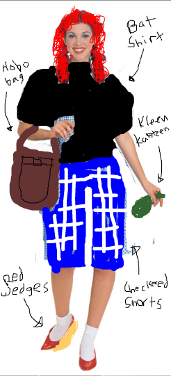As you can see I've updated Dorothy's look (on a model originally wearing a Dorothy costume), replacing her picnic basket with a hobo bag, her checkered blue dress thing with a bat shirt (one of those shirts with the bat sleeves?) and checkered blue pants as a nod to the original, her dog with a Kleen Kanteen, and her classic ruby slippers with red wedges, probably like espadrilles or something. Oh and I made her hair curly and red. Interesting choice!