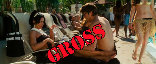 Spread is about a very handsome young man named Nikki living in Los Angeles. We know this because the very first line of the movie is an Ashton Kutcher voice over explaining that he is very handsome and lives in Los Angeles. This sort of sets up the narrative development of the rest of the movie. If the writers/director thought it was important information for you to have, someone will just say it to you directly with zero subtlety so that you don't get confuzed. Anyway, Ashton Kutcher moved to Los Angeles to live in beautiful mansions and drive fancy cars and sleep with models, again, all of this explained in voice over, and now he is doing that, he says, but you get the feeling that something's weird about it. He says it weird, you know? Well, what is weird about it is that Nikki is actually homeless and broke, so the way that he lives in beautiful mansions and drives fancy cars and sleeps with models is by preying on wealthy women and fucking his way into their stuff. Uh oh! I've already got some problems with the basic logical tenets holding together the plot of this movie!