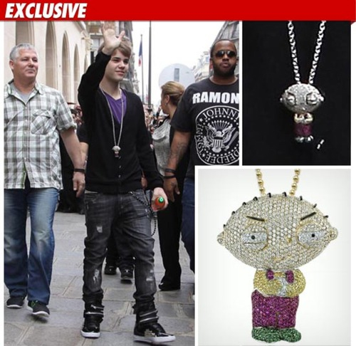 Well, right. Of COURSE Justin Bieber, a 12-year-old actress from Canada famous for her role as Justine Biebo in the 3D movie Never owns a jewel-encrusted necklace in the shape of a Family Guy character that is worth $25,000. What? Is she going to NOT own a jewel-encrusted necklace in the shape of a Family Guy character that is worth $25,000? Be realistic! It's called "balling out of control" and the ladies love it. (By ladies, of course, I mean other 12-year-old girls, the same age and gender as Justin Bieber.) Guys, I'm just kidding, Justin Bieber is not a girl. He's a boy, silly! Also, he was in a 3D movie, but it was a concert film. He's not an actor (yet), he's a chanteuse! I said all those things as a goof. You know what's not a joke, though? Justin Bieber really does own a jewel-encrusted Stewie chain that's worth $25,000 and that is ridiculous. (Via PopCultureBrain.)