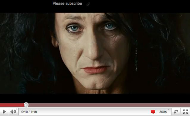 Remember back in September when the first images leaked of Sean Penn in Robert Smith goth-drag makeup leaked from the set of some movie called This Must Be The Place in which he played an aging rockstar NAZI HUNTER?! You remember. Go remember. Obviously, that was hilarious. We all had a lot of fun with that one. Look at his silly head! That's the kind of thing we would say back then. Because back then, all we had was pictures, we didn't have the preview clip that has been posted to the Internet (and re-posted after the jump), we couldn't actually hear his TINY STUPID BABY VOICE!?!?!