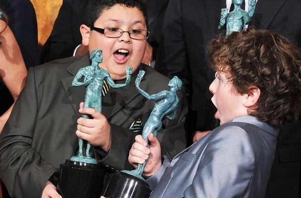 This photo features Rico Rodriguez and Nolan Gould of Modern Family playing dolls with their SAG Awards statuettes. Awww. Kids use their prestigious industry accolades as dolls to have a doll fight during the step-and-repeat post-ceremony photoshoots the darndest things! Yup, just a couple of kids being super normal kids wearing suits and ties and receiving awards for the network sitcom they star in for more money than any of us make. You know, kids stuff. They deserve it, though. They're good enough on that show, which itself is good enough, I guess. And until America returns to its place at the forefront of child replicant technologies (stupid #1 China) we just don't have the software to make a believable enough child replicant to star in our sitcoms, so some kid has to put on the makeup. Congrats, you two! And goofing around suggests that maybe they are still human children after all. But the real question is WHAT ARE THE SAG STATUETTES THINKING?! (I'm sure that's the real question. We were all asking it. In our heads. Which are normal.)